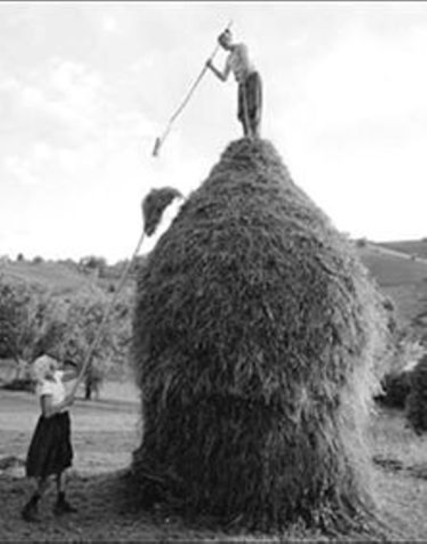 Il fieno doveva intrecciarsi, come una tela. Più si saliva su di altezza e più il pagliaio si restringeva, assumendo la forma di un cono e da ultimo diventava talmente alto che il bisnonno Guido doveva scendere con una scala lunghissima. Il fieno veniva così conservato per nutrire le vacche e i buoi durante l’inverno. Costruire un pagliaio era un’arte e un errore poteva compromettere la conservazione del fieno. Un pagliaio ben fatto era impermeabile e il fieno, per conservarsi bene, doveva diventare molto compatto tanto che per toglierlo usavano il tagliafieno.