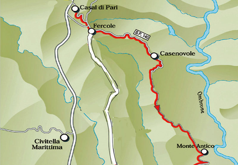 Dall’abitato di Fercole, nei pressi di Casal di Pari, si imbocca la sp 140 Leopoldina in direzione Casenovole scendendo fino  al caseggiato rurale di Poggio La Pila per poi proseguire per 1,2 km tra cipressi, roverelle e lecci fino al suggestivo viale di cipressi che conduce al castello di Casenovole. Si continua attraverso un paesaggio che spazia sulle colline circostanti, con boschi e terreni coltivati, fino al crinale che sovrasta la vallata dell’Ombrone  in direzione di Monte Antico. Superato il castello la strada discende verso Monte antico scalo, lambisce la stazione ferroviaria e lungo la piana dell’Ombrone raggiunge Paganico. … vai alle foto del percorso