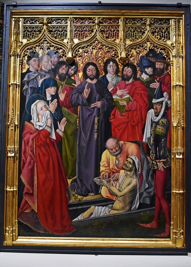 Vi sono raffigurate al centro la resurrezione di Lazzaro alla presenza delle sorelle Marta e Maria, protagoniste delle scene raffigurate a sinistra in cui Marta va incontro a Gesù sulla strada di Betania per avvisarlo della morte del fratello, mentre nello sportello a destra Maria rende omaggio a Gesù ungendogli i piedi con un balsamo profumato. Fu realizzato dal pittore francese Nicolas Froment e trasferito nelle collezioni granducali nel 1777, dal 1841alla Galleria degli Uffizi.