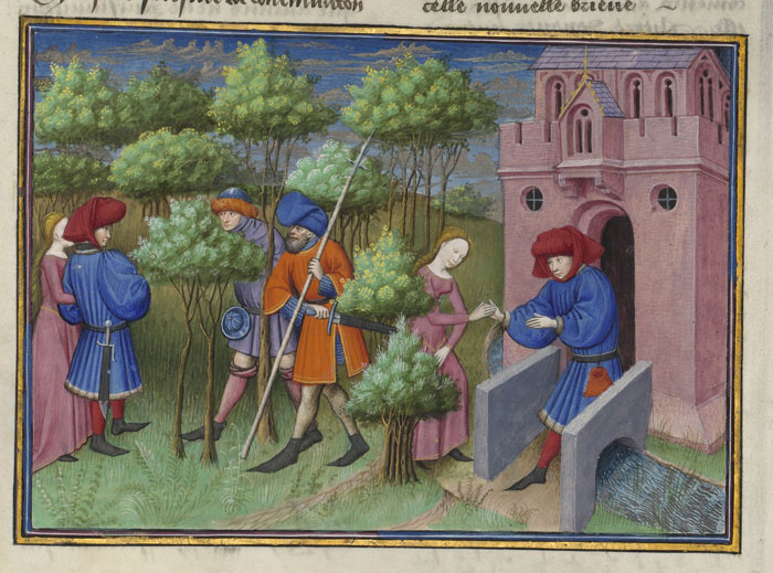 Ismontati adunque i due giovani e nello alberghetto entrati, primieramente i loro ronzini adagiarono, e appresso, avendo ben seco portato da cena, insieme con l’oste cenarono. Ora non avea l’oste che una cameretta assai piccola, nella quale eran tre letticelli messi come il meglio l’oste avea saputo, né v’era per tutto ciò tanto di spazio rimaso, essendone due dall’una delle facce della camera e ‘l terzo di rincontro a quegli dall’altra, che altro che strettamente andar vi si potesse. Di questi tre letti fece l’oste il men cattivo acconciar per li due compagni, e fecegli coricare; poi dopo alquanto, non dormendo alcun di loro, come che di dormir mostrassero, fece l’oste nell’un de’ due che rimasi erano coricar la figliuola, e nell’altro s’entrò egli e la donna sua; la quale allato del letto dove dormiva pose la culla nella quale il suo piccolo figlioletto teneva.