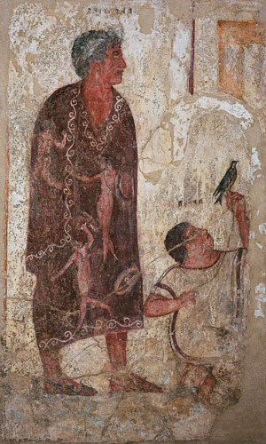 Nella Tomba François – databile alla metà del IV secolo a.C. – presso la Necropoli di Ponte Rotto a Vulci su di una parete dell’atrio è raffigurato Vel Saties (forse il committente della tomba). La figura maschile è in piedi, è coronata ed indossa la toga picta purpurea, ornata di figure di danzatori e pirrichisti. Il volto è rivolto verso l’alto per trarre auspici dall’osservazione del volatile (un picus martius) che il piccolo Arzna (un nano o un ragazzo?), accovacciato ai piedi dell’aristocratico, tiene legato con la destra e lancerà con la sinistra. L’azione augurale sembra da mettere in relazione con un’impresa militare (veste trionfale di Vel Saties).