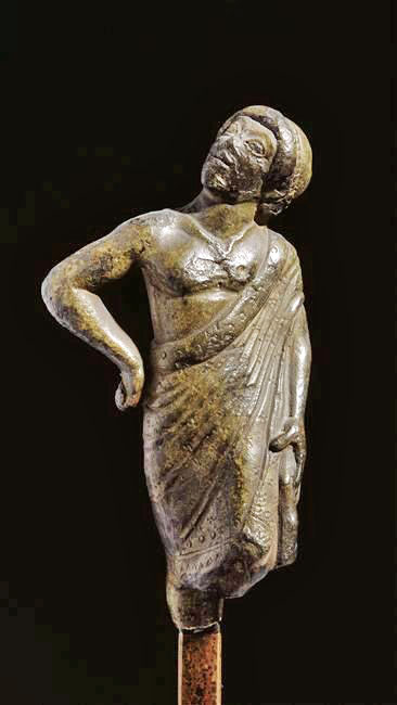 Bronzetto di augure, databile al 500 – 480 a.C., conservato al Musée du Louvre a Parigi. Il sacerdote (alt. cm 8, privo della parte inferiore delle gambe), forse di produzione volterrana, è rappresentato, stante, in posa rituale durante l’osservazione del volo degli uccelli. Il personaggio, che veste una tebenna, volge la testa in alto verso destra, tiene il braccio destro sul fianco e si appoggia col sinistro ad un bastone nodoso.