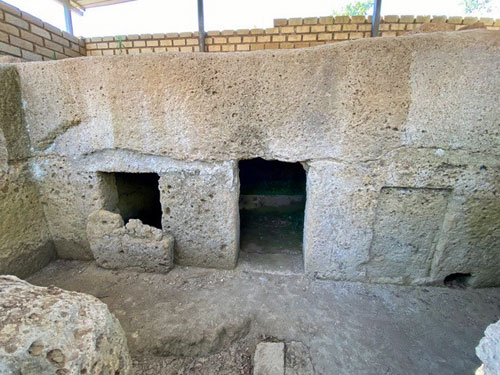 L’ipogeo, al quale si accedeva tramite un lungo dromos a cielo aperto, presentava un vestibolo con due porte ed un’unica camera in posizione asimmetrica rispetto agli accessi. Per qualche motivo la terza porta (individuabile dai segni sulla parete) non fu mai realizzata.