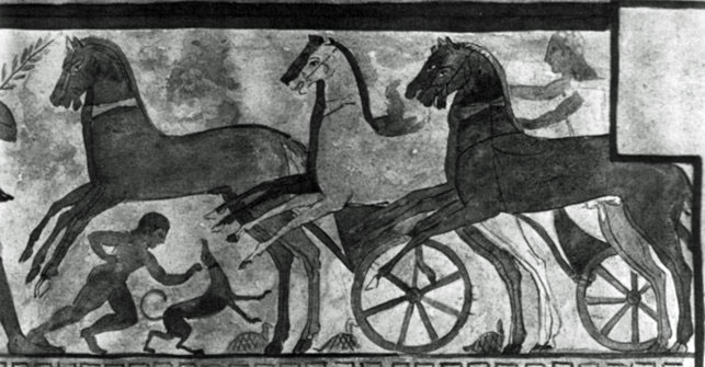 Corse di carri a due (bighe) o tre cavalli (trighe, con due cavalli timonieri ed uno esterno libero) appaiono su alcune tombe di Tarquinia (tombe delle Olimpiadi, del Maestro delle Olimpiadi e delle Bighe) e di Chiusi (tombe del Colle Casuccini, di Poggio al Moro e della Scimmia) ed in alcuni rilievi chiusini dal VI al IV secolo a.C. Probabilmente a Chiusi la corsa su carri era il gioco funebre prevalente. La triga risulta il tiro più ricorrente in Etruria.