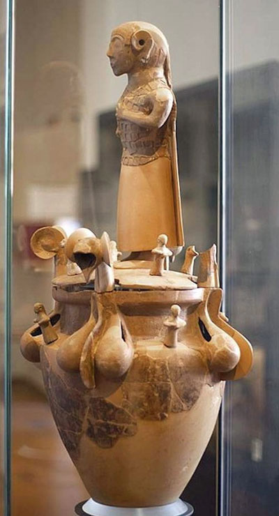 Il cd cinerario Paolozzi, urna chiusina databile intorno al 620 a.C, trovata a Dolciano (Chiusi) nel 1873, è decorato con la statuetta della defunta posta sul coperchio dell’ossuario. La donna è circondata da otto figurine di piangenti (quattro sulla spalla e quattro sul coperchio) di piccole dimensioni con braccia piegate in avanti e poggianti sopra i seni.