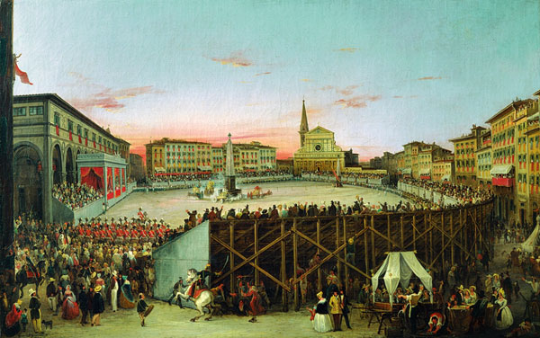 Piazza Santa Maria Novella, gremita di fiorentini che dalle impalcature predisposte assistono alla corsa dei cocchi, intorno all’obelisco, mentre un barroccio per le bibite distribuisce bevande agli avventori.