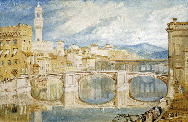 Joseph Mallord William Turner, pittore e incisore, nasce nel 1775 a Londra. La sua formazione prende le mosse nell’ambito della tradizione inglese della pittura di paesaggio nella volontà di elevarla al livello della grande pittura di storia fino a diventare il più completo e innovativo paesaggista del suo tempo per la ricerca continua delle potenzialità del colore, per la tecnica ad acquerello, per l’aspetto non finito delle sue opere che sembrano avvolte in un’atmosfera di vapore. Diversi pertanto i suoi paesaggi rispetto a quelli di altri autori coevi e successivi che raffigurano scorci di Firenze quando tra il 1802 e il 1840 Turner inizierà il suo Gran Tour verso l’Italia, dove soggiornerà in varie città anche se non in modo continuativo. Furono in tutto cinque i viaggi che fece nella nostra penisola che lasciò un’impronta notevole nelle sue opere soprattutto per l’uso del colore e la scelta del medesimo: Firenze sembra galleggiare come in una nuvola di luce:
