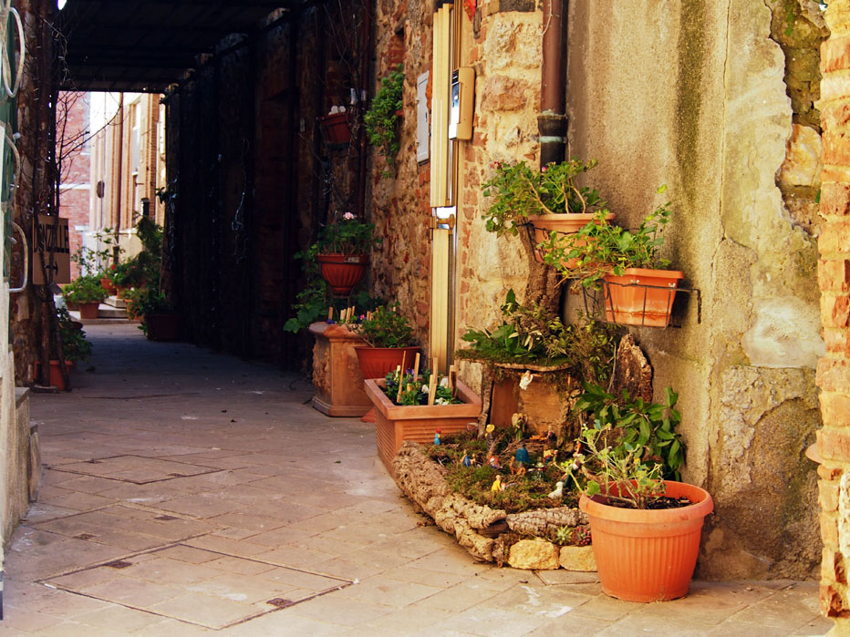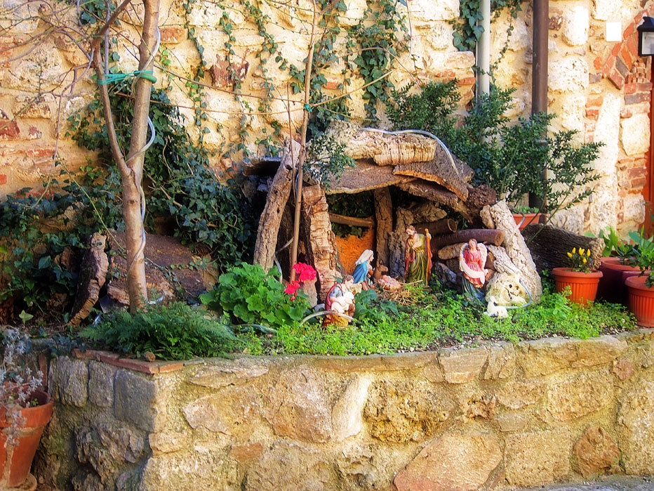 Ce n’è anche uno meccanico in cui i personaggi si muovono e il più “vecchio” che occupa la bella piazza della Cisterna con le belle statue di terracotta. La loro storia ebbe inizio ben trent’anni fa con i presepi viventi organizzati da alcuni giovani di Nomadelfia, così ci racconta la signora Maria, la proprietaria della bottega di Alimentari, essa stessa tra gli artefici e direi meglio, tra gli artisti che hanno saputo realizzare queste opere, alcune in ambientazioni particolari come un’antica stalla, con manichini a grandezza naturale; ma è Montorsaio che con la sua struttura urbana sa accoglierli in una location unica e incredibile a cui le luci che si accendono al tramonto sanno conferire un tocco di magia.