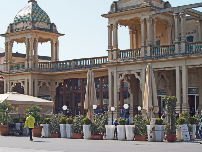 E lungo il viale l’ex Cinema Savoia del 1929 con le decorazioni in ceramica delle Manifatture Chini, il Cinema teatro Eden con la sua tettoia in ferro battuto e vetro, il gran Caffè Margherita con le sue verdi cupole a cipolla o il numero civico 48 dei Magazzini Duilio che svetta in alto avvolto in un nastro azzurro sopra il finestrone spartito in tre da lesene che ne intersecano il grande arco. E ancora, villini del periodo precedente come, in una traversa della passeggiata, in via D’Annunzio, il villino “Il Guscio” del 1914 o il villino “Rina” del 1903 in Via Leonardo da Vinci e il villino “Flora” del 1912 in Viale Carducci.