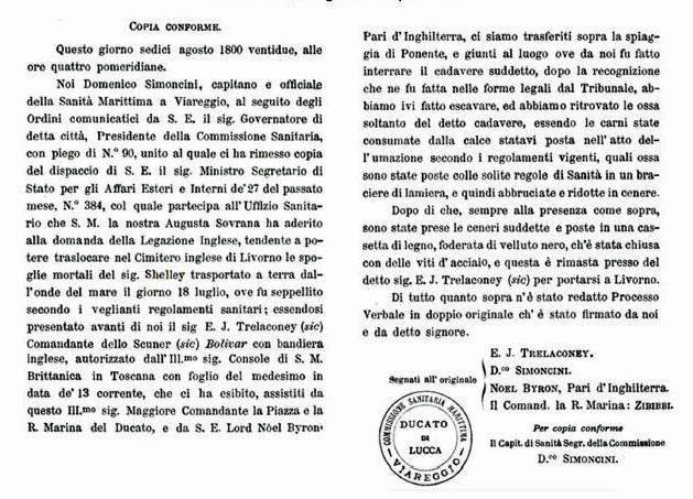 Byron, la moglie e l’amico Trelawny accorsero a Viareggio e volevano disseppellire il corpo di Shelley per poi portarlo al cimitero di Livorno, ma questo venne loro proibito nel modo più assoluto. I tre inglesi ottennero solo che le ceneri fossero trasferite altrove previa esumazione e cremazione sul posto del cadavere.