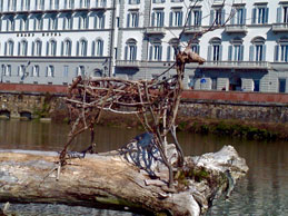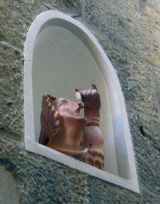 via Toscanella angolo Borgo San Jacopo: La Madonna del Puzzo che Mario Mariotti realizzò nel 2003 per contestare i cassonetti della spazzatura. >