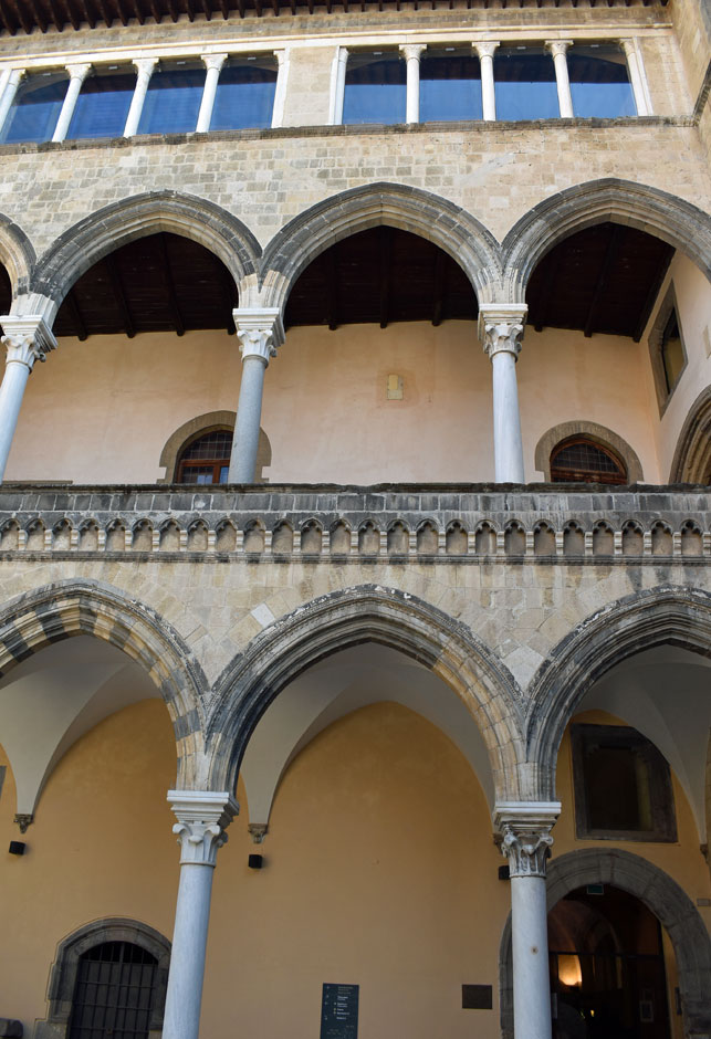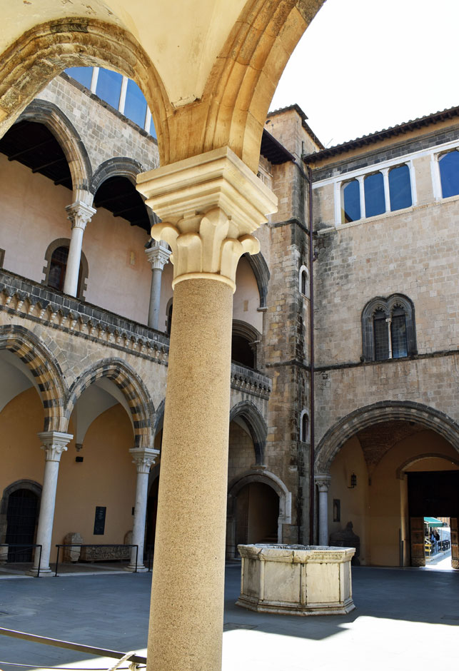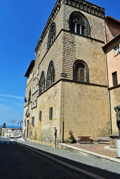 La sua mole massiccia è alleggerita dalle belle bifore e dalle trifore che ne adornano la facciata sulla Piazza Cavour. Superato il portone di accesso, un ampio ed elegante cortile a doppio porticato con arcate gotiche dove si ripetono decorazioni bicrome dovute ai diversi tipi di pietra utilizzate, il macco, la pietra calcarea locale dal caldo colore giallo, e il nenfro, una varietà di tufo grigio scuro e compatto. In alto un loggiato con colonne corinzie. Al centro un pozzo ottagonale con lo stemma dei Vitelleschi.