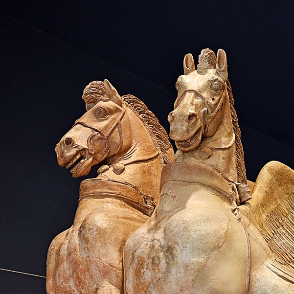 - al secondo piano, in sale climatizzate, gli affreschi di alcune delle tombe della necropoli di Montarozzi (Tomba del Triclinio, Tomba delle Bighe, Tomba della Nave e Tomba delle Olimpiadi) che riproducono la struttura della tomba da cui, con un lavoro di estrazione particolarissimo, sono stati, per motivi conservativi, ricostruiti in questa sala. Sempre a questo piano l’altorilievo dei Cavalli Alati, proveniente dall’Ara della Regina rinvenuto nel 1938, facente parte della decorazione del frontone del tempio dell’Acropoli. (NB Per quanto concerne le tombe della necropoli ricostruite in questa sala del Museo, si rimanda ad un articolo dedicato di prossima pubblicazione)