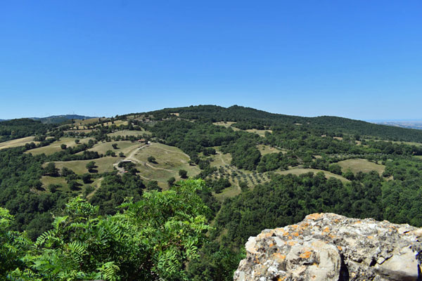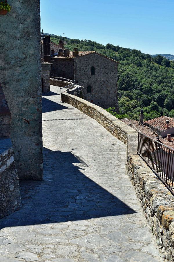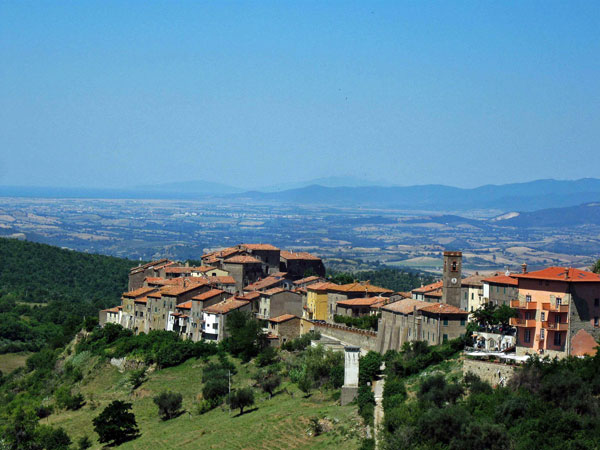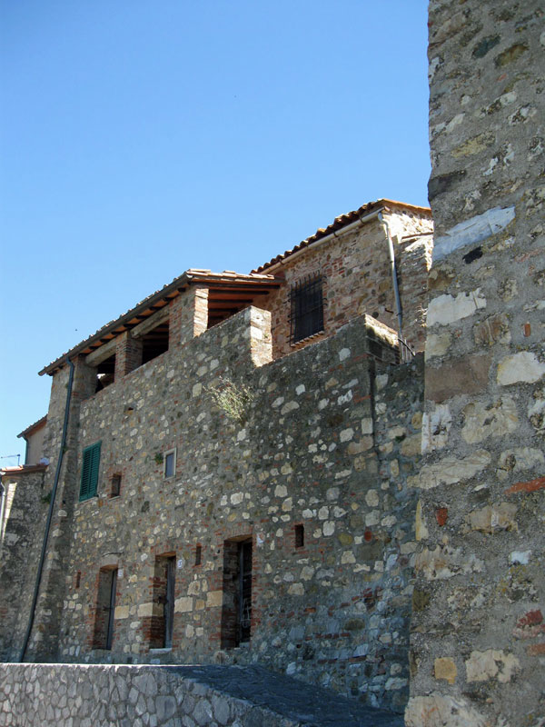 La pietra grigia conferisce austerità al complesso che tra scorci e abitazioni si affaccia su un paesaggio che solo la Maremma sa presentare al visitatore: il verde intenso della vegetazione arbustiva che riempie colmandoli i crinali di dolci colline, l’orizzonte dove s’intuisce la costa e gli spazi lavorati con i gialli e i verdi dei campi coltivati e degli olivi.