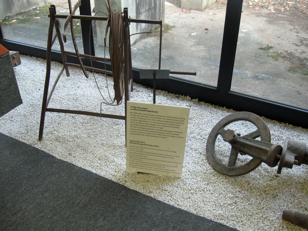 Da non dimenticare, anzi da fruire subito all’inizio della visita, la visione di quattro filmati che raccontano in modo incisivo ed essenziale le tecniche antiche di estrazione, il lavoro delle maestranze, le fonti di energia utilizzate, legate soprattutto a quella muscolare di uomini e animali, le trasformazioni nel tempo e anche le nuove macchine che hanno alleggerito il lavoro dell’uomo, davvero pericoloso e pesante dei tempi più lontani, basti pensare che il martello pesava due chili e il cavatore o il rifinitore battevano per otto ore. Un piccolo spazio ma che avvicina sicuramente il visitatore a questo mondo, che spesso conosce e ammira solo nel prodotto finito, che coniuga ambiente e materiali, abilità, creatività, fornendo un quadro ampio che avvicina alla cultura del marmo attraverso la memoria storica, nel Museo documentata, di un percorso secolare.