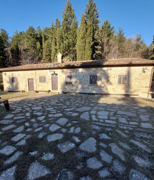 Adesso il monte Verruca sembra veramente vicino, l’orizzonte si apre ed ecco appare il rifugio alpino di Castellonchio, situato a 591 mt s.l.m. all’interno del complesso demaniale Giogo-Casaglia. Non c’è anima viva, mi godo con pienezza questo luogo meraviglioso e lo esploro in tutta tranquillità. Tre edifici ristrutturati con cura e in perfetta sintonia con l’ambiente, nulla è fuori posto. È una base scout e qui tutto è ordinato e curato. Un bel tabernacolo con maternità realizzata a piombo su vetro, veglia su questo rifugio.