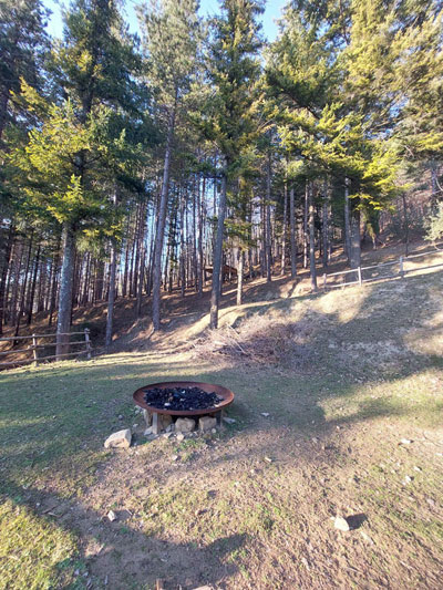 Ci sono spazi attrezzati per momenti ludici, come il grande braciere, dove immagino che tanti giovani possano cantare e suonare la chitarra. Per le calde serate estive, ci sono aree di ritrovo e conversazione al fresco di abeti secolari. Una grande tettoia si presta ad offrire rifugio ai viandanti in caso di pioggia. Scelgo una delle tante panchine in legno, mi siedo e sorseggio dalla borraccia il mio the allo zenzero ancora caldissimo.