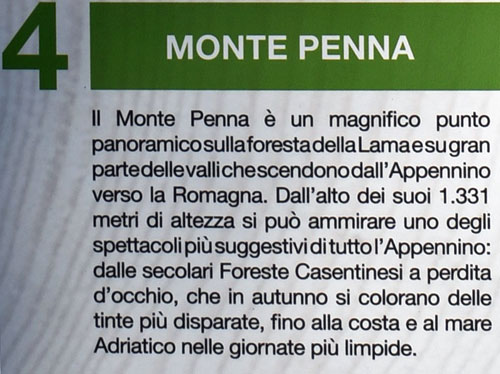 Dopo un centinaio di metri si apre un bivio: attenzione, a noi è capitato, il cartello indicativo per il Monte Penna è stato rimosso, va preso il sentiero più a sinistra, quello che resta più in piano.