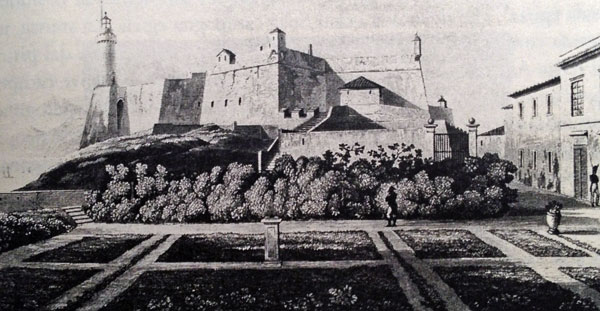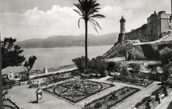 Le varie specie di agrumi, importate da Napoleone in quello che voleva essere un giardino di aranci, male si adattavano in una posizione aperta ai venti soprattutto quelli freddi invernali. Questo impianto fu modificato nel ventesimo secolo, pertanto oggi troviamo nella parte antistante la palazzina grandi alberi: lecci, sempreverdi, cipressi e palme che ancora svettano tra le strutture difensive dei bastioni a strapiombo sul mare e, nella seconda parte del giardino a quattro quadranti, una fontana con una statua in marmo bianco copia della Galatea, una delle ninfe del mare, attribuita al Canova per la quale pare avesse posato Paolina Bonaparte, oggi nella Galleria Demidoff a Villa San Martino, la residenza estiva di Napoleone. Una fontana a ninfeo chiude prospetticamente lo spazio verde. In questa parte del giardino anche piante particolari: una lussureggiante Carissa dai bei fiori bianchi e dai frutti rossi e piante di rose dal ceppo antico. Nel primo giardino una Minerva, e sul parapetto del bastione che si affaccia sullo strapiombo, il grande stemma con l’aquila imperiale. Oggi l’antico rigoglio e l’originale impianto sono offuscati dalla trascuratezza: resiste un vecchio leccio a più rami e un’alta palma, tra i più antichi abitanti naturali del giardino antistante la Villa. Resta una vista maestosa che dall’alto domina il mare aperto.