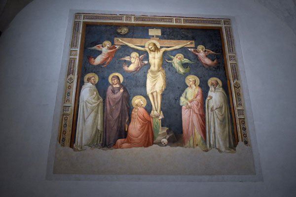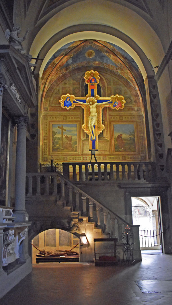 Si tratta di un’opera eseguita da Giotto, tra il 1315 e il 1320, per la chiesa d’Ognissanti: una grande Croce, ma itinerante, che vuol dire trasportabile a mano. Si legge nel foglio illustrativo: “La croce rappresenta il rapporto dolorifico del devoto che si accosta con la sua umanità (vedi i volti struggenti di Maria e Giovanni) e la pacata accoglienza del cristo che riceve le nostre pene. La distanza tra il sostegno (la Croce) e la figura (Cristo) ottenuta con il contrasto tra l’oro e i lapislazzuli rispetto al suo incarnato livido, stimola la vicinanza con il penitente”.