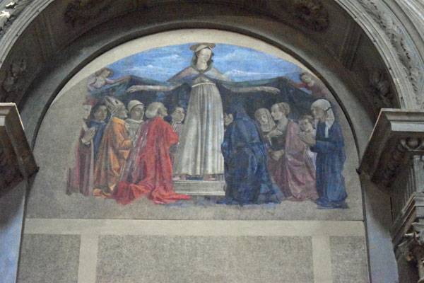 In alto nella lunetta la Madonna della Misericordia che, con le braccia allargate e i lembi del mantello sorretti da due angeli, accoglie alcuni membri della famiglia Vespucci: dietro la figura della Vergine il volto di un giovane: probabile ritratto di Amerigo? In basso un “Compianto” si precisa e non una deposizione, essendo la croce lontana dal corpo del Cristo di cui colpisce la giovane età nel volto di un giovane uomo di trentatre anni, così come si tramanda.