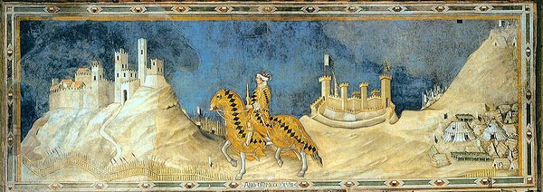 Ancora oggi possiamo quindi ammirare nel celebre affresco quella che fu probabilmente l’originaria struttura del castello. La grande sala del Mappamondo, che accoglie la Maestà di Simone Martini, nella parte alta della parete di fronte presenta “La presa del castello di Montemassi”. Il cavaliere Guidoriccio, Capitano Generale di Guerra del Comune di Siena dal 1327 al 1333, è la figura che si staglia in primo piano a cavallo, avvolto in un mantello ricamato con le insegne della famiglia come sulla gualdrappa del cavallo. Alle spalle l’accampamento dell’esercito senese e tra le due figurazioni, particolare interessante, e precisamente alla destra del cavaliere, su un’altura che fronteggia Montemassi, un “battifolle” sulle cui torri sventola la Balzana senese e le insegne di Guidoriccio, e un “trabocco”, due dei sistemi di attacco tipici dell’epoca: la prima una fortificazione in legname e la seconda una catapulta per il lancio delle pietre. Tutto intorno al luogo assediato una palizzata dalla quale spuntano lance e bandiere.