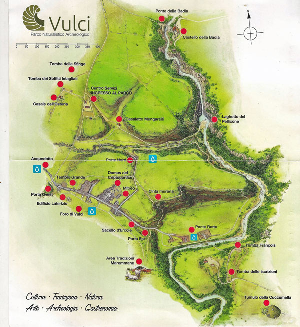 Il Parco naturalistico-archeologico di Vulci è un vero spettacolo per il visitatore e per i resti etrusco romani e per il paesaggio che li accoglie, disseminati a destra del Fiora, con la necropoli alla sinistra del fiume. Passeggeremo in questo ameno paesaggio, segnato dai sentieri tracciati e delimitati dagli steccati del Parco dai quali si affacciano paciose mucche bianche dalle ampie corna, e dove i resti dell’antica Vulci ci vengono incontro, antiche presenze in un ambiente naturale che pare immutato.