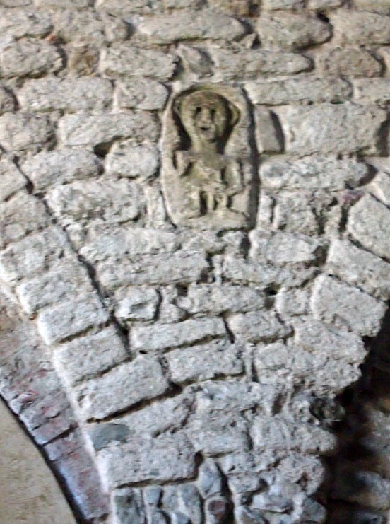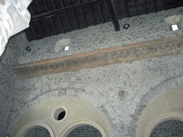 I capitelli sono appena accennati e mancano le tipiche decorazioni romaniche anche se un particolare colpisce subito l’occhio del visitatore attento: tra le due arcate della navata centrale sul lato sinistro si vede bene, anche nell’oscurità dell’interno, una figura incisa, un personaggio maschile, un Priapo?