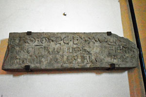 Entrando a sinistra nella parete interna della facciata colpisce una lapide con iscrizione in latino del 1275. Si trovava in origine presso la Cappella della Compagnia e l’iscrizione ricorda di essere stata un ospedale: reca anche la firma dell’incisore “Mastro Panizza”.