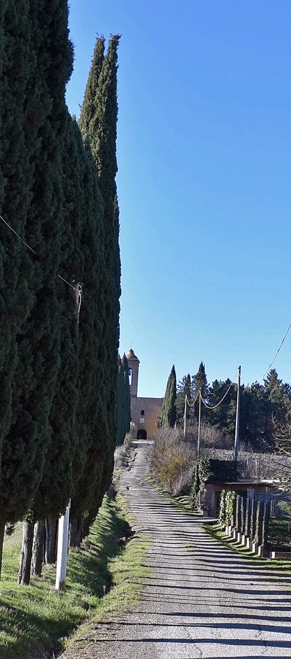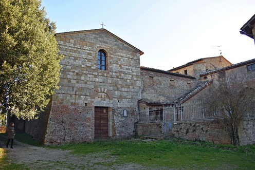 Una strada bianca fiancheggiata da filari di cipressi ci conduce in salita verso il complesso fortificato in mattoni rossi e con una base a scarpa datato XII secolo che fu castello e grancia. Una porta ad arco immette in un bel cortile cinquecentesco con pozzo, porticati e archi. Se si procede a sinistra dell’arco d’ingresso, una poderosa costruzione alta e rosseggiante ci accompagna: sempre in mattoni rossi, domina con la sua mole, alta e massiccia, il paesaggio circostante. A destra ci si avvia verso un ampio spiazzo su cui si erge la facciata della pieve, dell’XI secolo, lineare, bicroma per l’alternanza di travertino e laterizio, la cui base si allarga nella parte bassa in mattoni rossi.