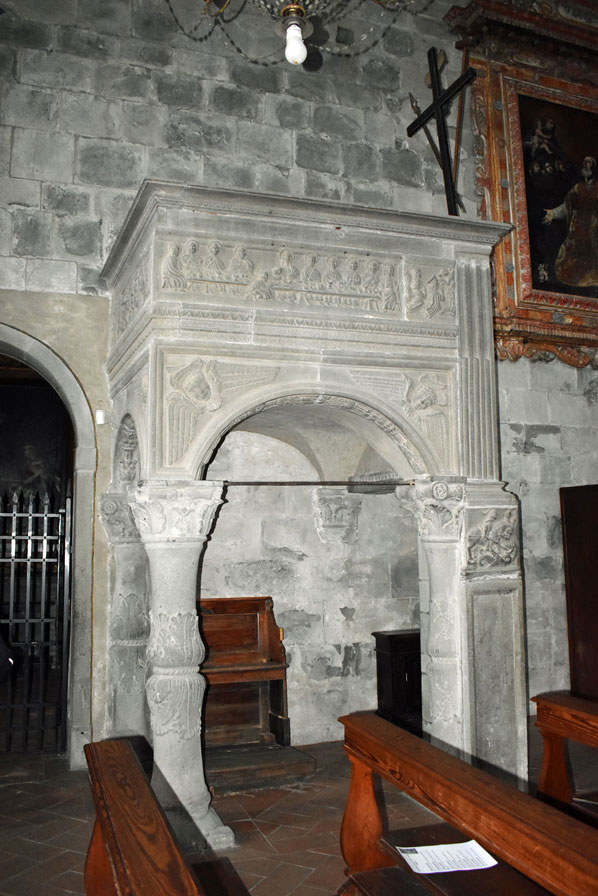 Addossato alla parete a sinistra il pulpito con bassorilievi di epoca romanica