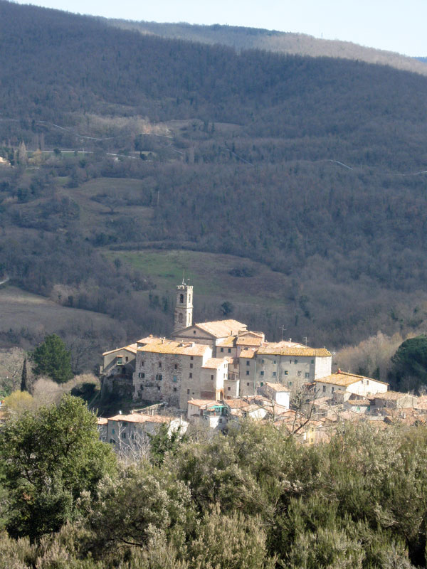 A questo spettacolo fumoso e ribollente della valle sottostante l’antico centro medievale di Montecerboli deve anche alcune varianti nell’etimo del suo toponimo. Da alcuni infatti viene indicato in mons cerberi, monte di Cerbero, dedicato al guardiano infernale che Dante raffigura come un cane a tre teste derivandone la figura dalla mitologia greca, altri sostengono che tale etimo possa invece derivare da mons cervuli o monte del cervo. Decisamente più affascinante il primo vista la posizione del piccolo borgo appollaiato com’è su un cucuzzolo di gabbro, la roccia eruttiva di cui si compone, quasi a guardia, come Cerbero, dell’inferno sottostante.