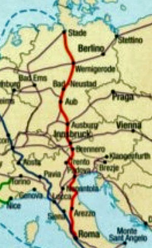 Questo itinerario è, analogamente alla Via di Sigerico, un itinerario storico, cioè documentato in una guida tedesca del XIII secolo e descritto dall’autore, l’Abate Albert di Stade come la Melior Via per e da Roma. Albert divenne abate del convento dei frati di San Giovanni della città d Stade, presso Hamburg nel 1232. Quando nel 1236 fallì nel tentativo di di cambiare la Regola della sua abbazia Benedettina secondo la riforma Cistercense, decise quindi di abbandonare la vita monastica e nel 1240 troviamo che si era unito alla comunità francescana della sua città. Quello stesso anno, probabilmente dopo aver compiuto un pellegrinaggio a Roma passando per il Passo di Serra, e da La Verna, iniziò la stesura dei degli Annales stadenses, conservati oggi nella Herzog August Bibliothek di Wolfenbuttel, in Sassonia. Una cronaca che inizia dalla creazione e termina nel 1256 e che altri o lui stesso continuarono fino al 1265. All’interno di questo testo troviamo la guida per il pellegrino in un racconto fittizio del viaggio a Roma e ritorno di due frati, Tirri e Firri. L’autore indica tre possibili itinerari per andare e tornare da Roma, L’itinerario di ritorno, che stiamo sviluppando come itinerario culturale del Consiglio d’Europa, è definito dall’autore la Melior Via ed è infatti non solo la via più breve e più logica, ma anche una via assai più antica dell’epoca in cui l’Abate Alberto la descrisse, poiché transitata dagli Ottoni e più tardi dagli Hohenstaufen. La rete viaria che for ma no gli it minerari di Stade e le due Vie Francigene sono state strumentali per le comunicazioni di prelati intellettuali, monaci, re e imperatori, che unirono culturalmente l’Europa che stava nascendo dopo le guerre gotiche e le prime invasioni teutoniche.