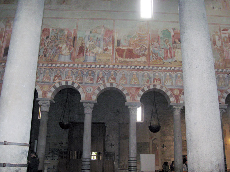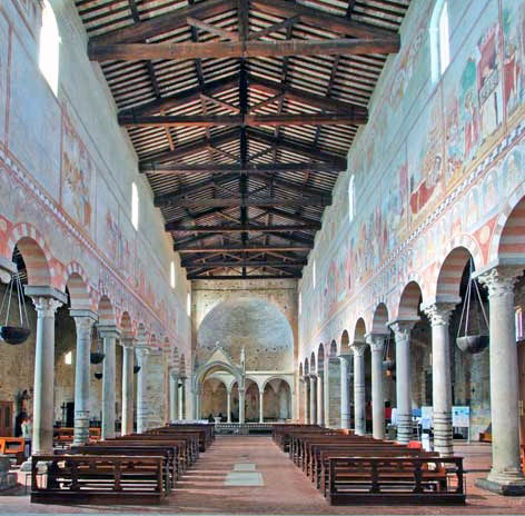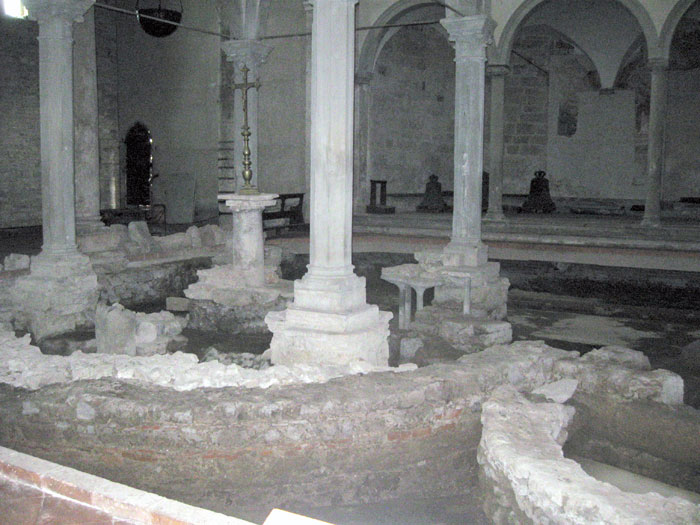 La basilica sarebbe sorta in prossimità dello scalo fluviale e lì Pietro avrebbe predicato come attesta un ciborio gotico del XIV secolo che “protegge” il luogo preciso della predicazione del più eminente degli apostoli. C’è menzione di una basilica già nel 375 e gli scavi mostrano,  all’interno dell’attuale basilica datata intorno all’XI secolo, le fondamenta di una costruzione paleocristiana successivamente ampliata.