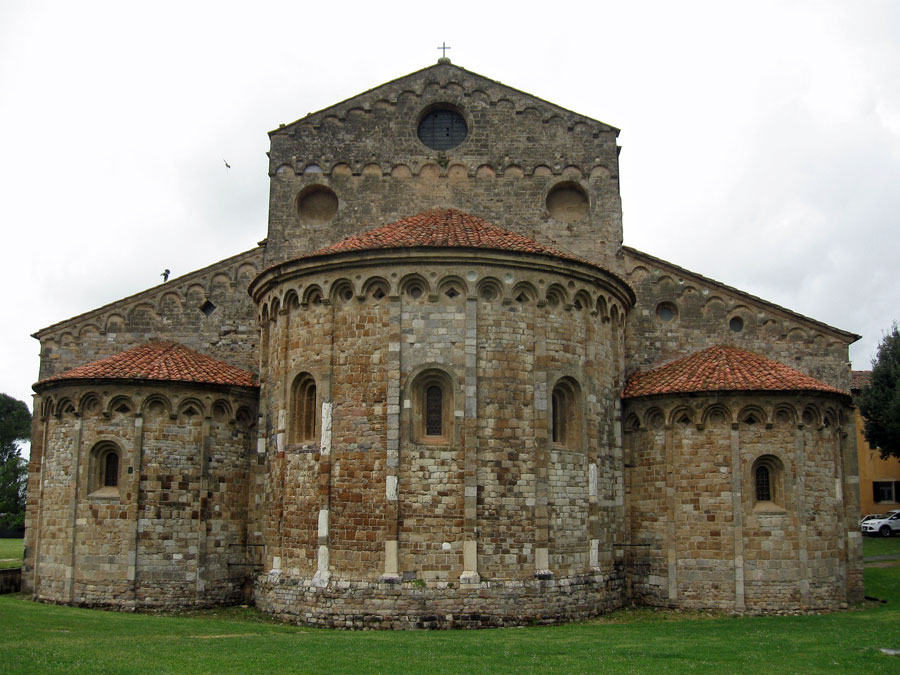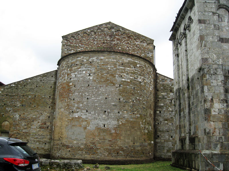 Una particolarità la contraddistingue: è dotata di due strutture absidali, quella a oriente con tre absidi e quella ad occidente con una sola, manca la facciata per cui l’ingresso è laterale. Tufo livornese e marmo di San Giuliano o di Monte Pisano, dove le estrazioni erano state iniziate già dagli Etruschi, più materiali lapidei di riutilizzo e di diversa provenienza, come anche le colonne e i capitelli all’interno, ne costituiscono l’esterno decorato da archetti, lesene, occhi, rombi e bacini di ceramica provenienti dai paesi del Nord Africa e del Mediterraneo.