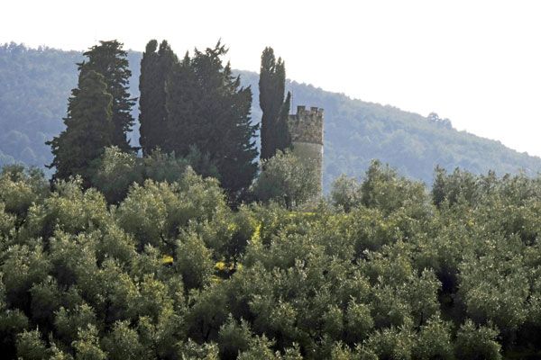 Senza alcuna indicazione, ma ben visibile a poca distanza dal castello omonimo, su per una strada sterrata, raggiungiamo la vetta del colle su cui possiamo riconoscere, in quel che resta, la struttura circolare di una torre con al posto della calotta su cui si muovono le pale, un groviglio secco, per la recente stagione calda e asciutta, di rampicanti intrecciati tra loro. Accedere non è il caso nonostante la sua porta sia spalancata e aperta ad eventuali visitatori, ma si rischiano crolli nella struttura che appare molto malandata e in completo abbandono. Non si hanno notizie certe sulla data di questo vecchio mulino, ma se ne conosce la struttura grazie ad una descrizione che ne fece nel 2001 Carla Romby, riportata nel libro di Baldini e Casprini* insieme a quella della propria visita: due gli ambienti, quello delle macine al piano terra e quello del magazzino situato al piano superiore cui si accedeva per una scala elicolidale in pietra serena. I pavimenti sono in quadroni di cotto sia al pino terra che al piano superiore. Ci consoliamo con la vista che da qui si gode del castello sul poggio dirimpettaio e di tutta la bella campagna circostante coltivata a olivi, un vanto di cui la Toscana va famosa nel mondo.
