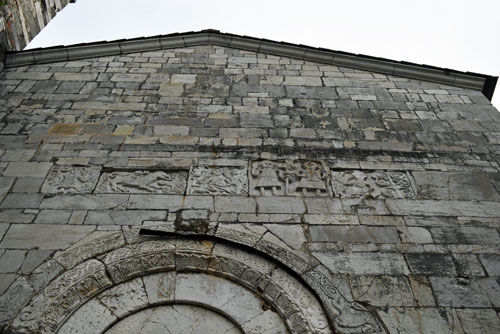 Nel primo bassorilievo, andando da destra a manca del prospetto, è raffigurato un uomo coperto da lunga veste, che, stando in piedi, tien con la diritta una croce in asta di forma orientale. Segue nell’ altro l’immagine d’ un leone, simbolo della forza e vigilanza della chiesa, che ruggendo e torcendo la coda, addenta la mano d’una figura ivi presso accovacciata. Vedesi genuflesso nel terzo, il principe degli apostoli avente da lato in simile attitudine, altra figura; e un angelo diritto della persona, che mostra un cartello ove è scritto PETRVS. Son nel seguente due santi, cui scende dagli omeri simil tonica, e senza posarsi innalzano l’uno la croce, pur di foggia bizantina con entro impressa la parola REX, l’altro una tavoletta ove leggesi LEVITA. Tra un albero, di rozza fattura, forse un olivo, forse anche un palmizio, ed alcuni uccelli, forse colombi, che par vi si voglian posare, si vede rappresentata una donna nel quinto rilievo.”