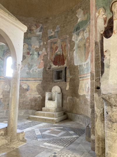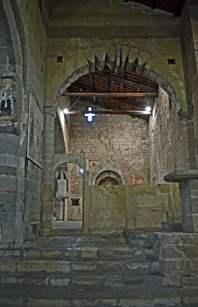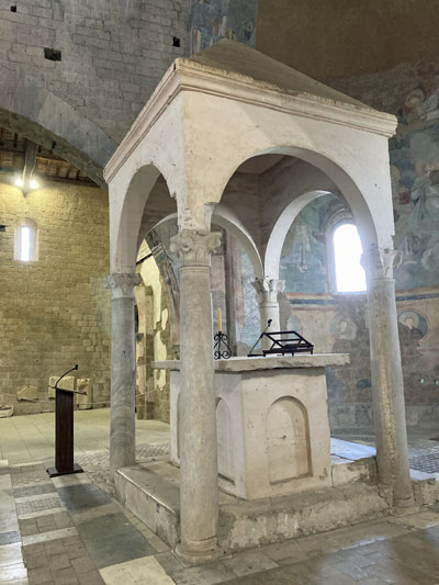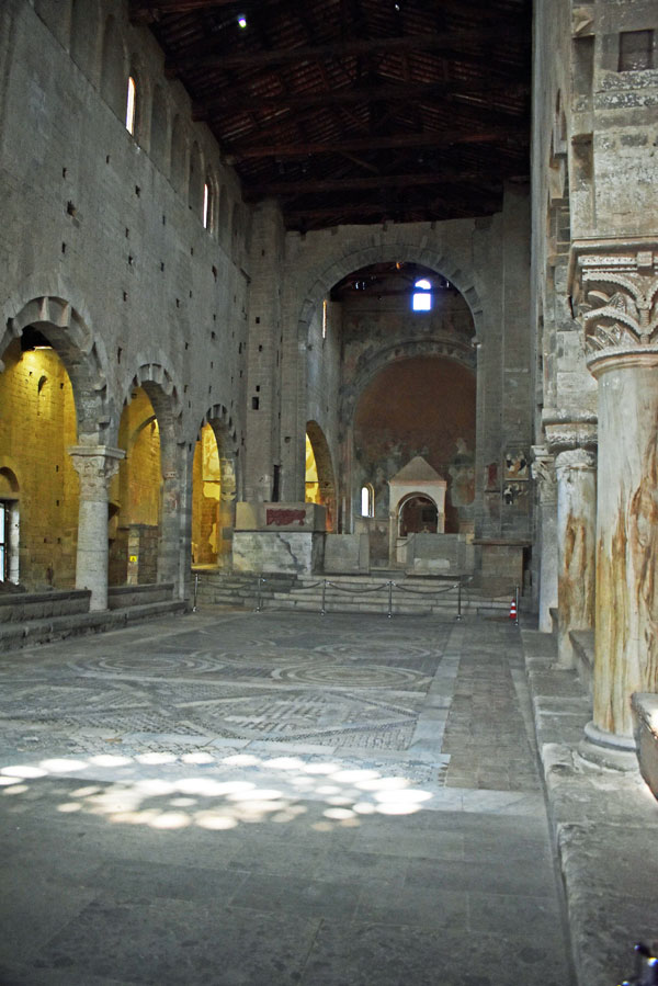 L’interno non è da meno, anzi. A partire dalla pianta: non perfettamente rettangolare ma trapezoidale convergente all’abside, permette al visitatore una visione complessiva dell’apparato spaziale che compone l’interno. Una particolarità che non avevo ancora vista in alcune delle chiese medievali visitate: le arcate sorrette dalle colonne presentano un decoro a doppia ghiera, di cui una “dentata” all’interno dell’arco; le colonne medesime sono collegate tra loro da muretti e sedili di pietra. Il pavimento cosmatesco, lo stile decorativo che lega il suo nome presumibilmente ai Cosmati una famiglia di marmorari romani attivi tra il XII e il XIII secolo, basato su intagli e intarsî di marmi policromi, di paste vitree e di tessere d’oro, è originario della fine del XII secolo; nel presbiterio un ciborio datato 1093.
