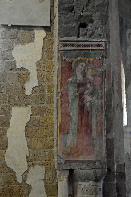 Un cenno, almeno, merita a mio avviso l’abside: stretta e alta domina il poggio e la vallata del Marta, come si può ammirarla da uno dei bastioni cittadini: una costruzione in tufi, riccamente decorata con un doppio ordine sovrapposto di lesene e archetti pensili, scandito orizzontalmente da più fasce decorative in laterizio che corrono lungo la semicirconferenza conferendo alla struttura un aggraziato, pur nella mole, motivo ornamentale che, come per la griera dentata delle arcate all’interno, non avevo mai ritrovato in altre strutture coeve.