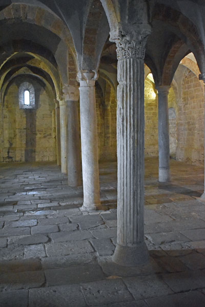 Dalle navate laterali si accede alla cripta a nove navate longitudinali, con ventotto colonne di svariate fogge e capitelli, prevalentemente di riutilizzo, che sorreggono quaranta volte a crociera: l’ambiente è altamente suggestivo. Nel 648 vi furono collocati i corpi dei santi protettori di Tuscania, Secondiano, Veriano e Marcellino.