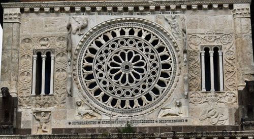 Il sole filtra dal grande rosone e illumina le navate e il ciborio in fondo e soprattutto la pavimentazione che con i suoi circoli marmorei di piccolo taglio, e chiari e rossi, occupa tutta la navata centrale, sgombra di scranni, lasciando così il dovuto spazio a tanta leggiadria creativa. Mi colpiscono subito le colonne e i capitelli, la foggia decorata degli archi a tutto sesto, i bassorilievi della balaustra centrale e la profonda quiete che infonde la spettacolarità dell’ambiente mi regalano un’emozione intensa provata poche volte all’interno di antiche chiese medievali.