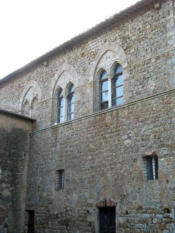 Accanto al campanile, sicuramente più antico, si apre una porta ad arco che introduce in un ampio piazzale occupato in parte da un chiostro e sull’altro lato da un caseggiato con stemmi e belle bifore a impianto ogivale. Elegante e sobrio il piccolo chiostro è costituito da un loggiato aperto da archetti sorretti da colonnine e capitelli di foggia diversa.