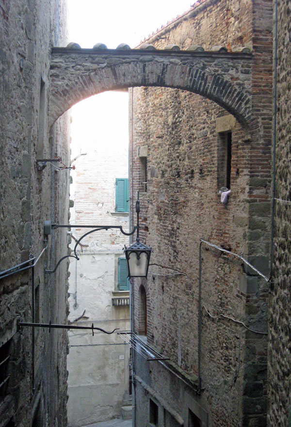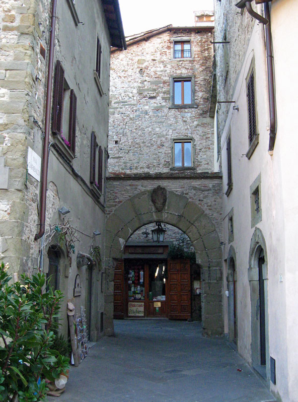 Entriamo da Porta San Martino, del 1204 completata con il secondo giro di mura, detta anche del Catorcio, il chiavistello di cui racconta in ottava rima nel suo poema eroicomico “Il catorcio d’Anghiari” del 1689 il prevosto Federico di Nomi, rubato dagli abitanti di San Sepolcro nel lontano 1450 durante le celebrazioni in onore dei santi Pietro e Paolo. Dalla piazza Baldaccio, dopo un breve tratto di strada sopraelevata, oltrepassiamo l’antica Porta che era in origine al di là di un fossato attraversato da un ponte levatoio ed era chiamata anche Porta del Fosso.