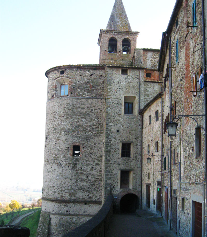 Su uno sperone tra la valle del Sovara e la val Tiberina Anghiari è un borgo munito che conserva una struttura medievale e bei palazzi rinascimentali. Al borgo vecchio si arriva percorrendo una lunga strada rettilinea e in discesa fino a piazza Baldaccio, capitano di ventura detto appunto d’Anghiari. Le mura che oggi circondano il borgo vecchio furono adeguate tra il XV e il XVI secolo alle nuove esigenze difensive legate alla scoperta della polvere da sparo, si presentano pertanto abbassate e ispessite. L’accesso avveniva da tre porte delle quali due, San Martino e Porta Nuova, erano protette da un fossato e da un ponte levatoio. Porta Nuova o Porta di Sotto, con un rimasuglio di stemma mediceo in sommo d’arco fu l’ultima ad essere costruita, risale infatti al 1460.