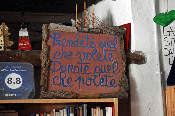 C’è una piccola bottega laboratorio dove Lucia, la proprietaria, espone le proprie creazioni in ceramica; poco più avanti un piccolo ambiente preceduto da una colorata panchina di grossi lapis multicolori: è la biblioteca dei libri liberi, un’iniziativa encomiabile e da copiare. Si entra, si cerca un libro, si legge.