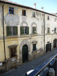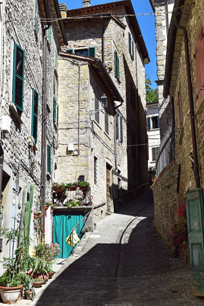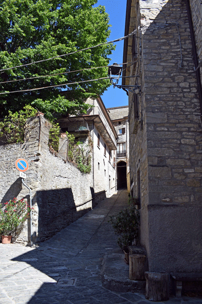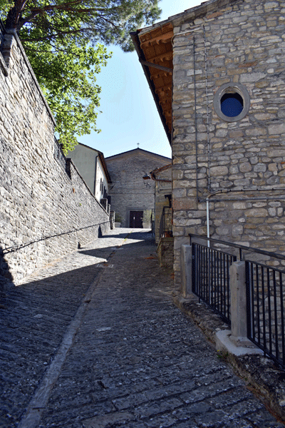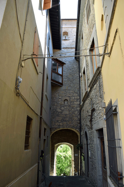 A sinistra un’erta porta alla chiesa, la parte alta del borgo, quella più antica, con tratti di mura difensive e il maschio, a pianta quadrata, fortificazioni appartenute al castello dei conti Guidi, che si innalza subito a sinistra dell’arco d’accesso.