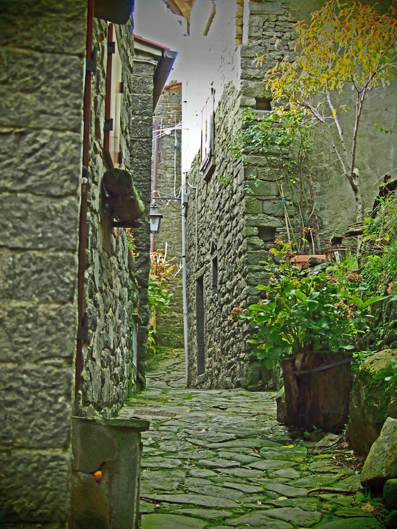 Ma scendiamo verso il borgo che merita una visita con le sue belle abitazioni di pietra grigia, scalinate e vicoli stretti i cui scorci pittoreschi sono adornati con macchie di ortensie e vasi fioriti.