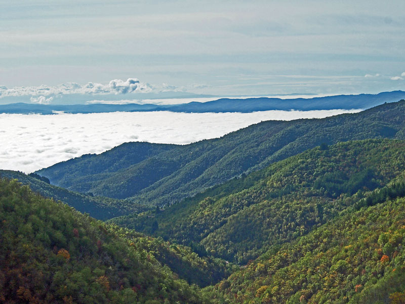 Anche se al profano sfugge la capacità di immaginare quanto manca rispetto a quanto rimane dei miseri ruderi dell’antico castello, non sfugge ad alcuno la magnificenza del panorama che si può ammirare a 360 gradi. In alto a sinistra la croce del Pratomagno, i crinali di verdi e di gialli che scendono verso Rocca Ricciarda, al centro oggi c’è un tappeto di nebbia palpabile che come panna bianchissima ricopre l’orizzonte, e ad ovest ancora crinali vestiti dei colori autunnali.