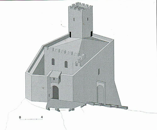 È proprio questo il periodo che accoglie il massimo della documentazione (inizi XIV – XV secolo) e, dalla ricostruzione in base ai dati archeologici, risulta un palatium di pianta quadrangolare, circondato da mura, e di una torre. L’accesso avveniva per una gradinata in legno, lì dove ora c’è quella in ferro, per pedoni e cavalcature, a metà della quale gli archeologi ipotizzano una prima porta d’accesso, come dimostra lo stipite sporgente ancora presente nella cortina muraria; nel punto più alto della rampa viene invece ipotizzato l’accesso con una porta protetta da una bertesca, una piccola sporgenza con caditoia, attraverso la quale si accedeva all’interno della cortina muraria stessa che si legava con la torre, posta all’estremità orientale, così come il palatium, rifinito con merlatura come la torre.