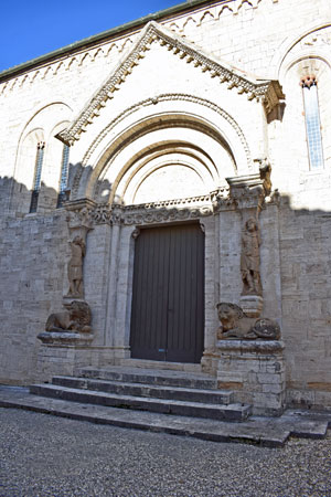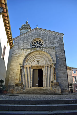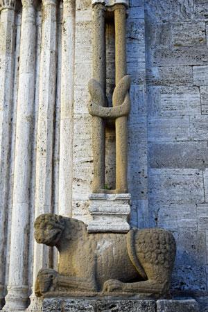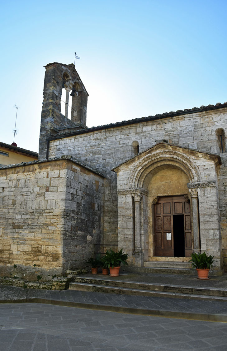 Torniamo indietro per visitare la costruzione più imponenete: la Colleggiata intitolata ai Santi Quirico e Giuditta, antichissima in quanto sorge sul luogo della pieve di Ossena datata 714, ricostruita nel XII secolo e poi ristrutturata nelle forme attuali nel XIII secolo. Colpisce il monumentale portale principale, in pietra arenaria e travertino proveniente dalla vicina Bagno Vignoni, con il protiro su colonne annodate sostenute da leoni, nel grande arco interno motivi simbolici e nell’architrave il bassorilievo con una lotta di mostri; in alto un rosone. Sul lato destro un altro portale dove spiccano le due caritidi poggiate su leoni, datato XIII secolo e attribioto alla scuola di Giovanni Pisano.